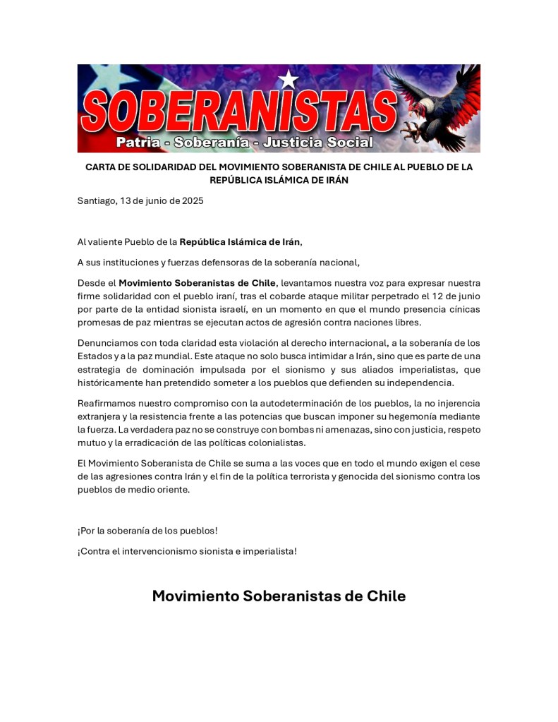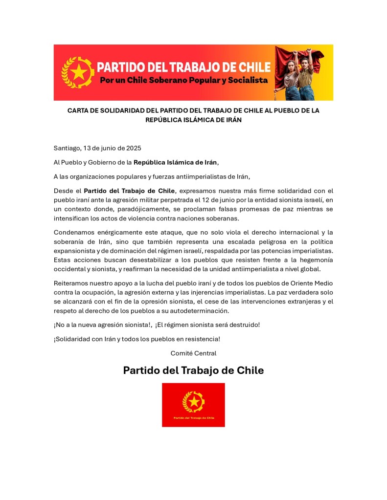 La Unión Bicentenaria de los Pueblos – Capítulo Chile declara su más firme repudio a la criminal agresión llevada a cabo por el régimen sionista de Israel contra la República Islámica de Irán, en el marco de una nueva escalada de violencia promovida por el imperialismo internacional, encabezado por Estados Unidos y sus aliados.