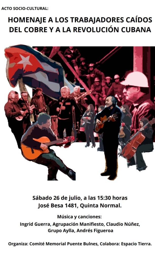 Este sábado 26 de julio de 2025, a partir de las 15:30 horas, en el local de Las Urracas de Emaús, José Besa 1481, Quinta Normal, Santiago, Chile; le rendiremos homenaje a esos trabajadores cupríferos brutalmente masacrados, por la canalla golpista, así como a revolucionarios caídos en la gesta de la revolución cubana.