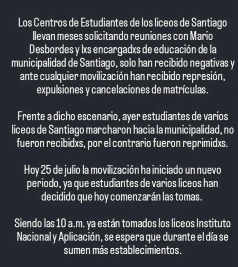 Este viernes 25 de julio estudiantes del Instituto Nacional y de los liceos N°1, N°4, de Aplicación y Barros Borgoño realizaron tomas de sus establecimientos educacionales como forma de protesta por la gestión del alcalde de Santiago, Mario Desbordes. Compartimos las siguientes fotos que circulan en redes sociales:
