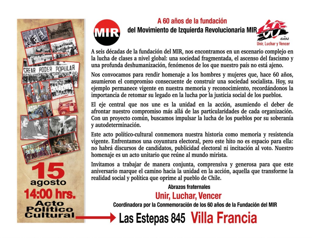 Este acto político-cultural conmemora nuestra historia como memoria y resistencia vigente. Enfrentamos una coyuntura electoral, pero este hito no es espacio para ella: no habrá discursos de candidatos, publicidad electoral ni incitación al voto. Nuestro homenaje es un acto unitario que reúne al mundo mirista.