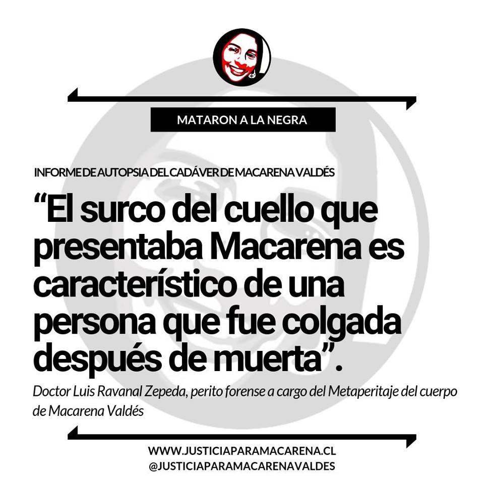 El 29 de julio de 2017, casi un año más tarde, el forense Luis Ravanal Zepeda, experto en Medicina Legal, llevó a cabo un metaperitaje, que colocó en duda aquel informe oficial: “No es posible descartar la participación de terceras personas en la muerte de Macarena Valdés, no hay signos de vitalidad en la zona que comprime el cuello, ninguna prueba de que ella no haya estado muerta antes de ser colgada y el surco del cuello que presentaba Macarena, podría ser característico de una persona que fue colgada después de muerta”.