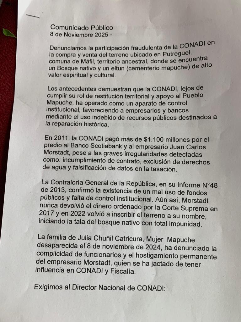 La familia de Julia Chuñil Catricura, Mujer Mapuche desaparecida el 8 de noviembre de 2024, ha denunciado la complicidad de funcionarios y el hostigamiento permanente del empresario Morstadt, quien se ha jactado de tener influencia en CONADI y Fiscalía.