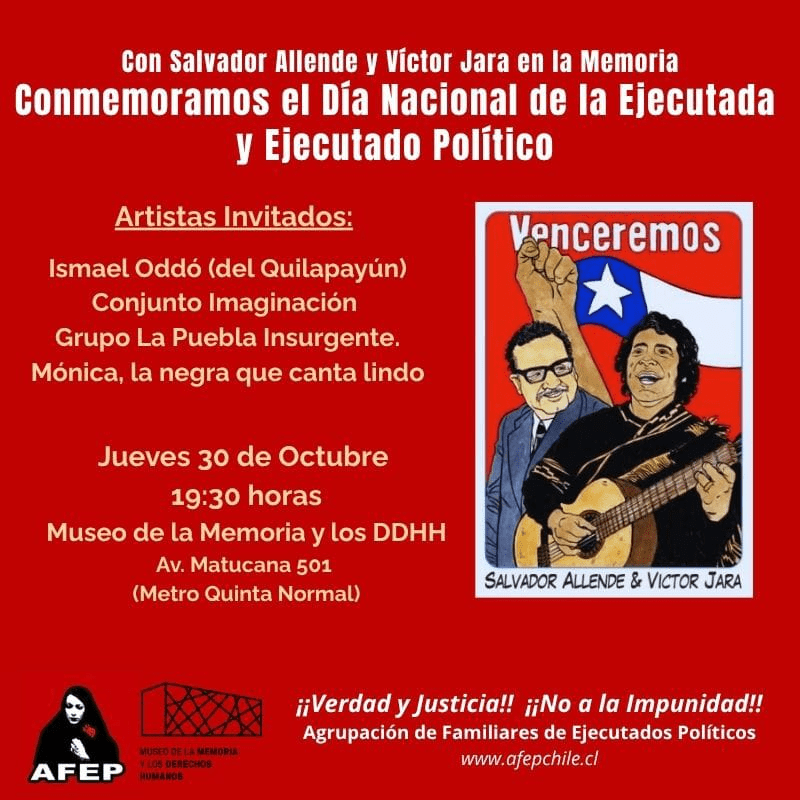 El acto se realizará este jueves 30 de octubre en la explanada del Museo de la Memoria y los Derechos Humanos a las 19:30 horas. Acompañarán el Conjunto Imaginación, Ismael de Quilapayún, Grupo La Puebla Insurgente y Mónica, la Negra que canta lindo.