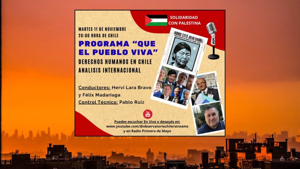 En el primer bloque, Hervi Lara, Félix Madariaga y Pablo Ruiz recuerdan el acto por el Día Nacional del Ejecutado Político en Chile; un año de la desaparición de la lideresa Julia Chuñil y el más largo estado de excepción en territorio mapuche; el posible cierre de la cárcel de Punta Peuco; y sobre las elecciones presidenciales, entre otros temas.