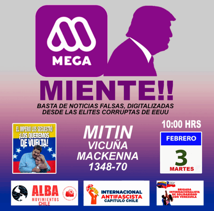 Durante la jornada de este martes, manifestantes pertenecientes a la Brigada Internacionalista de Apoyo a Venezuela, la Internacional Antifascista Capítulo Chile realizaron una protesta en el frontis del canal de televisión Mega, en Santiago de Chile, como respuesta a lo que denunciaron como reiteradas noticias falsas difundidas por el medio chileno sobre la situación venezolana.