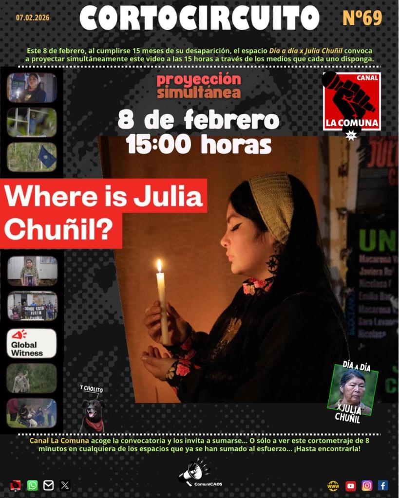 Cuando se cumplen 15 meses de la desaparición de Julia Chuñil, canal La Comuna se suma a la convocatoria del espacio «Día a día x Julia Chuñil» para realizar una transmisión simultánea, coordinada con otras organizaciones que también luchan por saber qué sucedió con la papay.