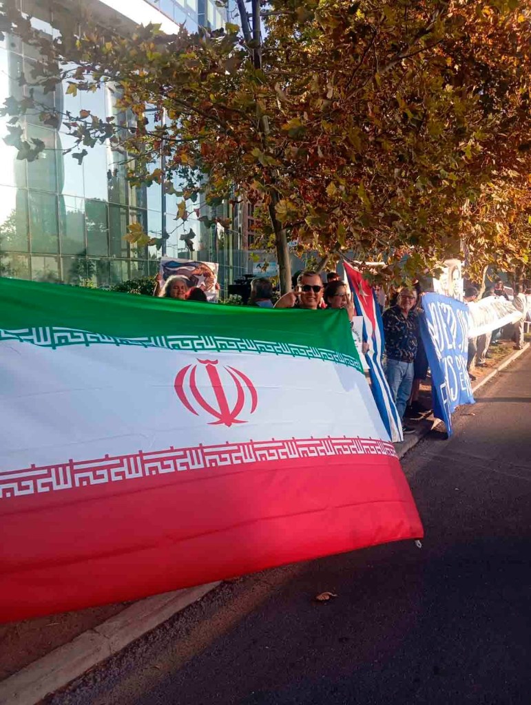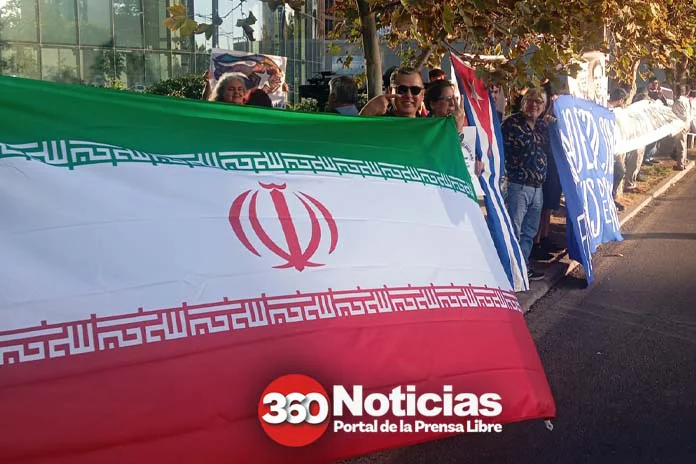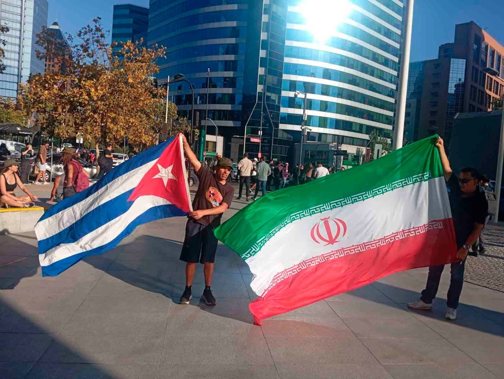 Los manifestantes portaron banderas de Cuba e Irán, además de lienzos y pancartas denunciando las agresiones e intervenciones militares impulsadas por Washington contra distintos pueblos del mundo. Durante la protesta se escucharon consignas como “Cuba sí, yanqui no” e “Irán seguro, al yanqui dale duro”, en señal de solidaridad con ambos países.