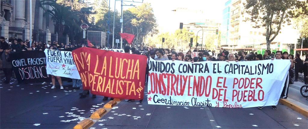 Durante el cambio de mando presidencial en La Moneda realizado este 11 de marzo, se verificaron múltiples protestas sociales en Santiago, Concepción, Valparaíso y Temuco, contrarias a la delegación estadounidense, al colonialismo belicista norteamericano y sus aliados, por la conquista de los derechos sociales inexistentes, el fin de la ejecución de leyes de abierta coacción arbitraria sobre los estudiantes secundarios; contra la impunidad represiva y a discreción de las policías o ley de gatillo fácil; por las demandas de la comunidad trans, y en contra del nuevo administrador de La Moneda, el extremista José Antonio Kast.