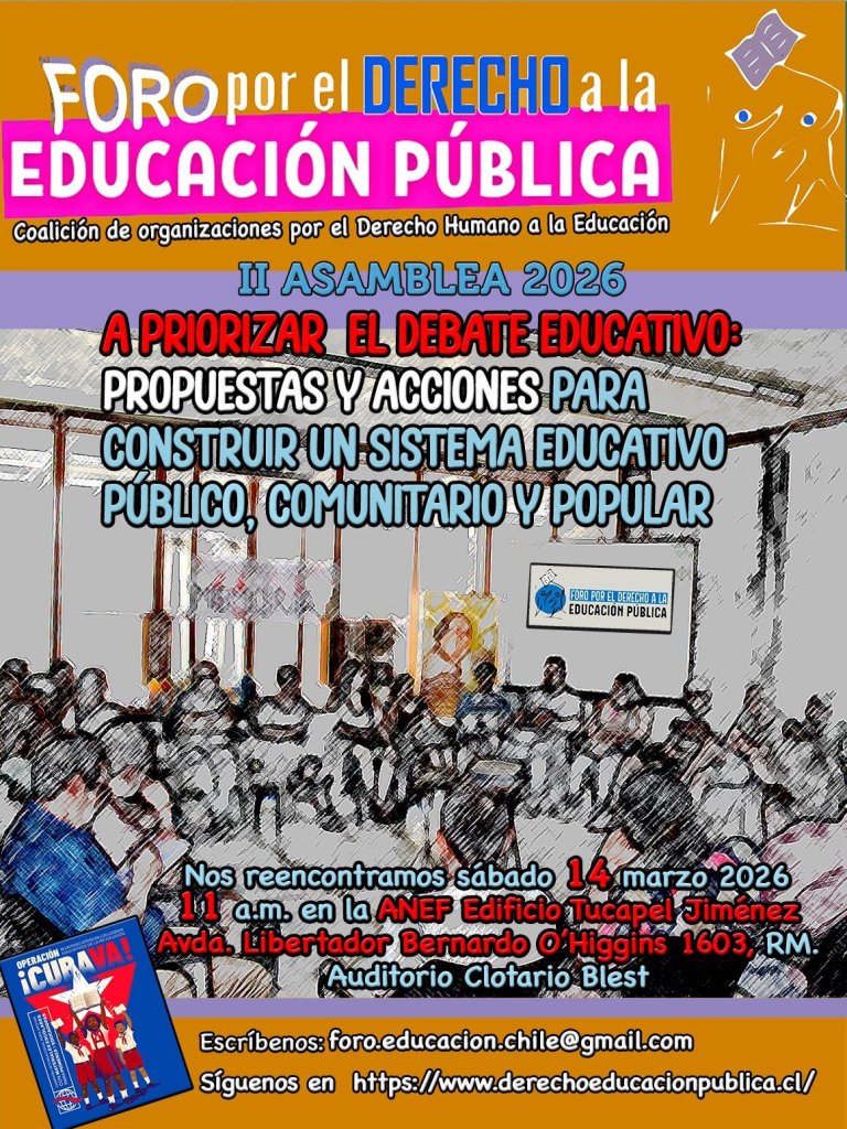 La II Asamblea Nacional del FODEP se realizará el sábado 14 de marzo en la sede de la ANEF, ubicada en Av. Libertador Bernardo O’Higgins #1603, Auditorio Clotario Blest, Santiago Centro. Tiene como propósito acordar propuestas y acciones conjuntas para la construcción de un sistema educativo público, comunitario y popular basado en la discusión de la I Asamblea del mes de Enero (adjuntamos acta). Será a partir de las 11 hrs. hasta las 14 hrs. La idea es traer colaboraciones alimenticias y/o bebestibles para compartir. Les pedimos aquellas organizaciones que asistirán la confirmación de su asistencia. Se trabaja de la siguiente manera (ver programa):