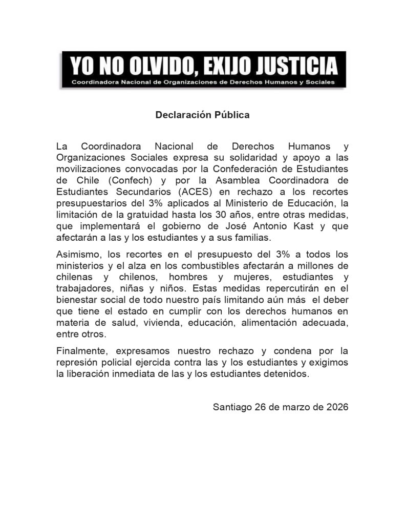 La Coordinadora Nacional de Derechos Humanos y Organizaciones Sociales expresa su solidaridad y apoyo a las movilizaciones convocadas por la Confederación de Estudiantes de Chile (Confech) y por la Asamblea Coordinadora de Estudiantes Secundarios (ACES) en rechazo a los recortes presupuestarios del 3% aplicados al Ministerio de Educación, la limitación de la gratuidad hasta los 30 años, entre otras medidas, que implementará el gobierno de José Antonio Kast y que afectarán a las y los estudiantes y a sus familias.