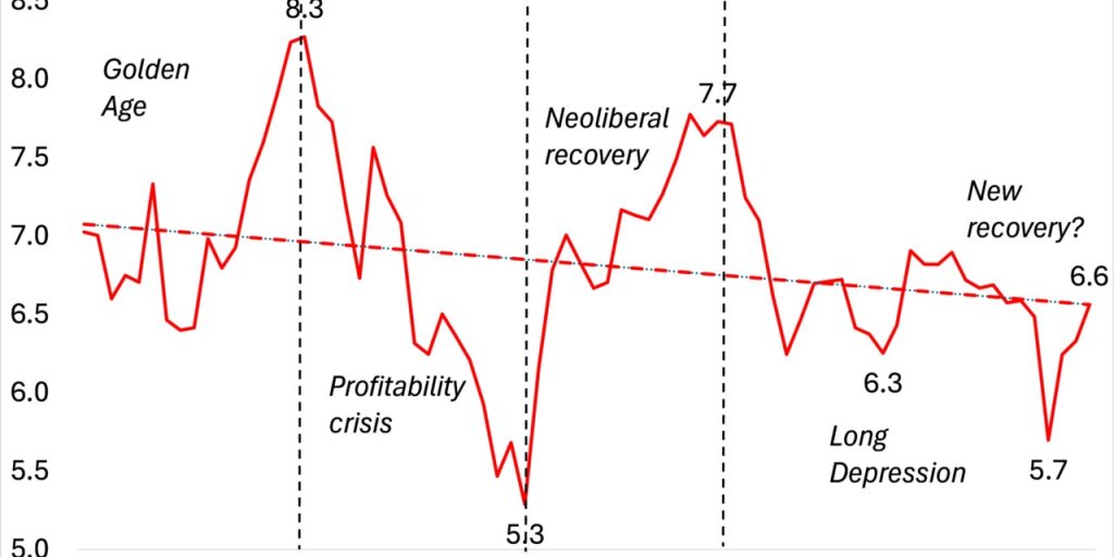 Él añade: “la caída de la tasa de ganancia no solo comenzó antes de la crisis de 2007-2009, sino que continuó después. Aunque hubo un rápido repunte en 2010, no hay señales de una recuperación general. Uno de los principales motores de las recuperaciones tras las crisis es la destrucción de capital, normalmente en forma de quiebras y devaluación del capital. Las políticas que impidieron quiebras a gran escala, con el objetivo de contener el contagio de la crisis, probablemente redujeron la destrucción de capital y, por lo tanto, frenaron la recuperación de la rentabilidad tras la crisis”.